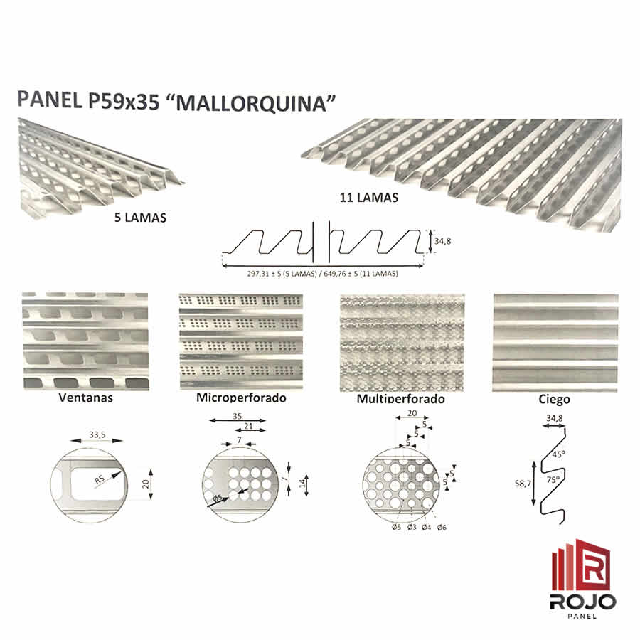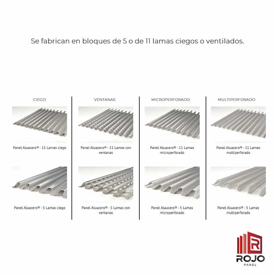 Los Paneles Aluacero® Mallorquina (P59x35) se fabrican en bloques de 5 o de 11 lamas ciegos o ventilados. La ventilación se efectúa mediante ventanas o microperforaciones ocultas bajo los pliegues, o a través de toda la superficie en el modelo multiperforado. Es posible combinar los diferentes tipos de paneles una misma obra.