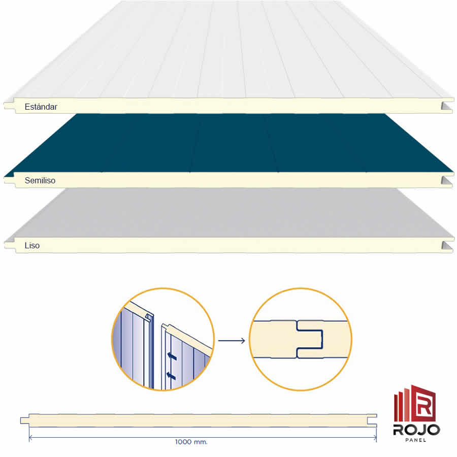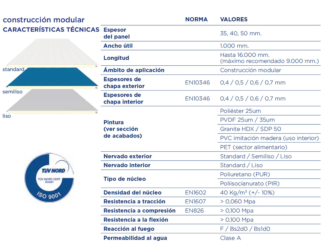 Los paneles Modulares son paneles prefabricados en línea de producción en continuo, y están compuestos por dos láminas de acero galvanizado y prepintado, unidas por un núcleo de espuma rígida de poliuretano (PUR) o poliisocianurato (PIR), formando un elemento tipo sándwich con una junta macho y hembra.
